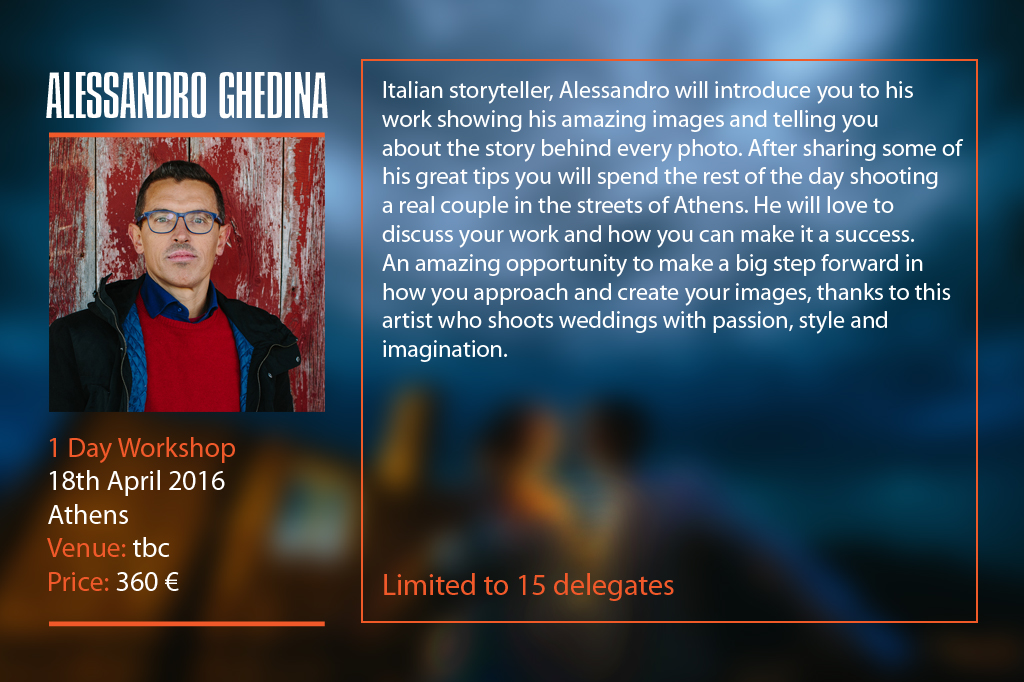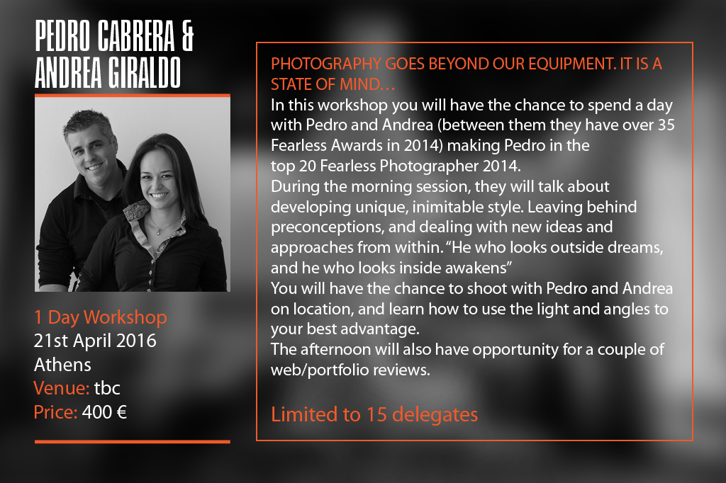 Enjoy one/two days with the Masters. In small groups of up to 15 people you will have a hands on opportunity, not only to watch – but to photograph alongside the speakers.
